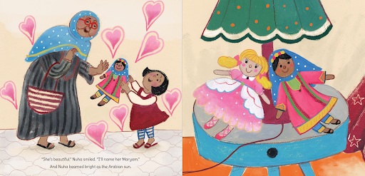 At first, Nuha is weary of all the ways Omani culture is different from what she knows — from the dancing and music to the women in abaya and hijab and from the brown dolls to the steaming street shawarma. But with Jadda’s gentle guidance and patience, Nuha begins to see Oman through fresh, unbiased eyes and comes to believe that her mother was correct in her assessment that Oman is their home away from home. In a symbolic ending where both Western and Middle Eastern culture and Christianity and Islam are bridged, Nuha finds a doll whom she names Maryam, the Arabic translation of Mary, and balance is restored.